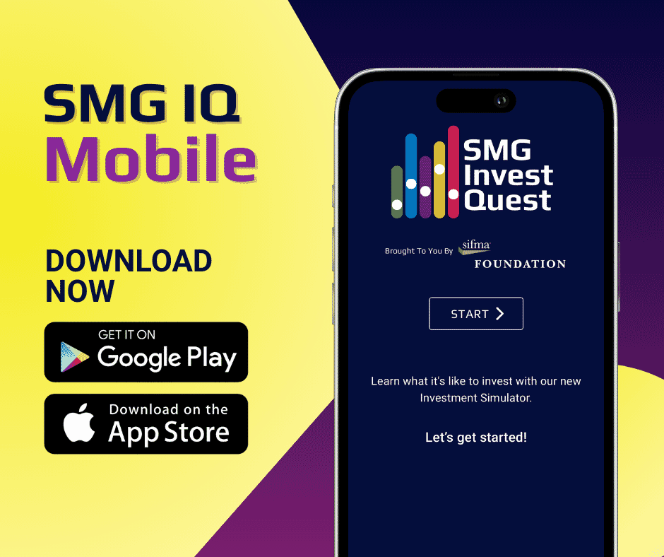 SMG InvestQuest™ Mobile is now available in the App Store! Start with $100,000 in virtual cash and explore the markets with stocks, bonds, and mutual funds. Enjoy SMG IQ’s easy-to-use interface and robust content for FREE! No Fee. No Registration. Don’t own an iphone or ipad? SMG IQ is coming soon to the Google Play store and remains available online here.